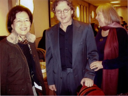 Ah, here we are at Din Tai Fung, the dim sum mecca (how's that for polyglot worldspeak?...towering babel?...). Obviously, we are having fun and enjoying the restaurant. There again, a mother and daughter came over to our table and asked to take a photo. The mother said, "We saw you on television," illustrating her enthusiasm by expertly playing an imaginary violin with her hands. Her daughter was a violin student. Touchingly, they gave me a bag of donuts they had with them as a gift. We couldn't say no to the donuts, and besides, I happen to love glazed donuts which do not exist where I live in France. But, in this photo you see Cassandra and our friend, the elegant Cora. In the next, We are with Charles and Cora at their beautifully architected bookstore in Taipei, later that evening: